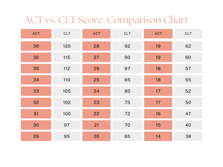 For every CLT or ACT score, there’s a corresponding score on the other test.This means that a 70 on the CLT is roughly equivalent to a 21 on the ACT, and a 120 on the CLT (perfect score) is equivalent to a 36 on the ACT.